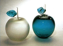 Наталья Полонникова: На нашей выставке представлено стекло под кодовым названием РЗЭ (редкоземельные элементы). Простому человеку непонятно, что это такое. Оно меняет цвет под разными углами освещения или под разными лучами. Соответственно, если на улице светло, а у вас стоит в помещении ваза, она будет такого розоватого цвета. Как только становится на улице темно, она тоже меняет цвет и будет серовато-голубоватых тонов. То есть, совершенно другое впечатление производит это стекло. Оно единственное в мире. Секрет производства, конечно же, они держат в секрете. Что еще для них характерно? Здесь очень много красного цвета. Это тоже связано с химией, с исследовательскими какими-то работами, прежде всего. Потому что красный цвет получить достаточно сложно. Иногда для красного добавляют селен. Но если передержать при обжиге стекло, то оно получится оранжевого цвета, то есть, сделать красный цвет достаточно сложно, чтобы он был такой яркий, насыщенный, такой как в Гусь-Хрустальном. Для каких-то оттенков красного добавляют иногда измельченный рубин. Поэтому красное стекло всегда будет дороже. Лиля Пальвелева: Хорошо, мы в основном говорили о технологии. Наверняка ведь работают какие-то художники, которые специализируются именно на стекле, чтобы такие разные вещи получались? Наталья Полонникова: Коллектив там совершенно небольшой. Есть небольшая часть художников - их всего три, и небольшая часть выдувальщиков, и тех, кто расписывает. Может быть, максимум человек 20 от начала и до конца делают эту работу. Поэтому это нельзя назвать массовым производством. Это ручной труд. Лиля Пальвелева: И это авторские работы. Наталья Полонникова: Безусловно, хотя участвует выдувальщик. В стекле это совместная работа, это не одного человека: Лиля Пальвелева: Здесь есть одна витрина с несколькими вещами, связанными с темой яблоко. Дерево черное с красными яблоками и отдельно - это сосуды какие-то в виде яблок? Наталья Полонникова: Нет, это просто фрукты - груши и яблоки. Любая вещь что-то символизирует. В частности, яблоко - это символ мудрости и знания. Лиля Пальвелева: Там какое-то очень сложное сочетание цвета. Яблоки внутри белых сосудов. Наталья Полонникова: Это вы смотрите на вишню во льду. Это пресс-папье <Вишня во льду>. Это многослойное стекло, то есть сделали сначала вишню, потом залили прозрачным стеклом. Здесь три стекла - зеленое, красное и бесцветное. Лиля Пальвелева: Я смотрю, у вас есть отдельная новогодняя серия. Расскажите об этих экспонатах. Наталья Полонникова: Это различные елочки, гномики, колокольчики с новогодней тематикой и круглые декоративные тарелки с собаками, с зимней деревенькой. Роспись в основном проводится золотом. Золото должно отжигаться для того, чтобы при том, что вы хотите помыть тарелочку или вазу, оно не слезло. Лиля Пальвелева: Это настоящее золото?
