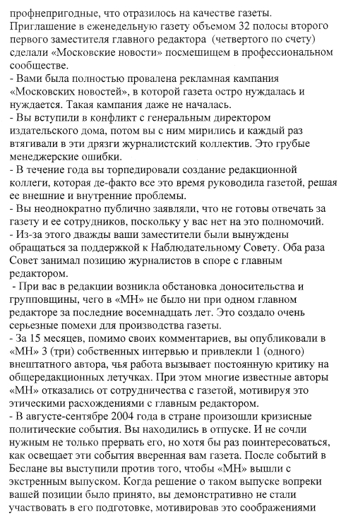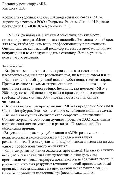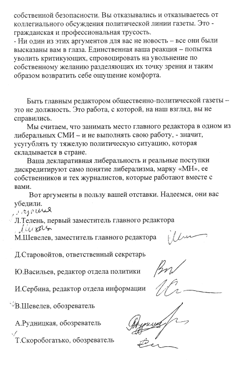 Общий список подписавшихся: ЗАЯВЛЕНИЕ АВТОРОВ ГАЗЕТЫ "МОСКОВСКИЕ НОВОСТИ" Мы, нижеподписавшиеся, заявляем об отказе от сотрудничества с главным редактором газеты "Московские новости" Евгением Киселевым в качестве главного редактора. Другие передачи месяца: